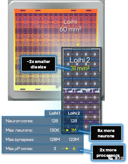 由于使用了全新工艺,Loihi 2 相比前代面积缩小了一半,但仍然包含 100 万个神经元,数量是前代的 8 倍,处理速度是前代的 10 倍。