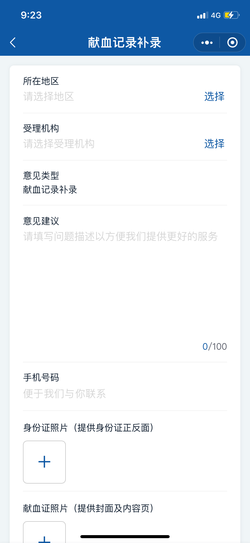 在“意见建议”中点击【献血记录补录】,输入“所在地区”、“受理机构”、“手机号码”、“身份证照片”、“献血证照片”等信息,提交审核通过后即可补录献血记录。