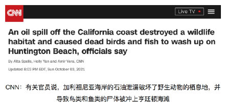在大规模漏油事故发生后,CNN援引奥兰治县官员的话称,“我们已经开始发现死去的鸟和鱼被冲刷上岸。”并敦促当地居民避开该区域,避免接触可能有毒的油污地区。