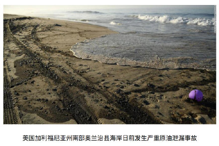 【 美国发生严重原油泄漏事故 ,当地市长警告:一场潜在的生态灾难!】美国加利福尼亚州南部奥兰治县海岸日前发生严重原油泄漏事故。据美国有线电视新闻网(CNN)3日报道,当地官员表示,此次漏油事故是"一场潜在的生态灾难"