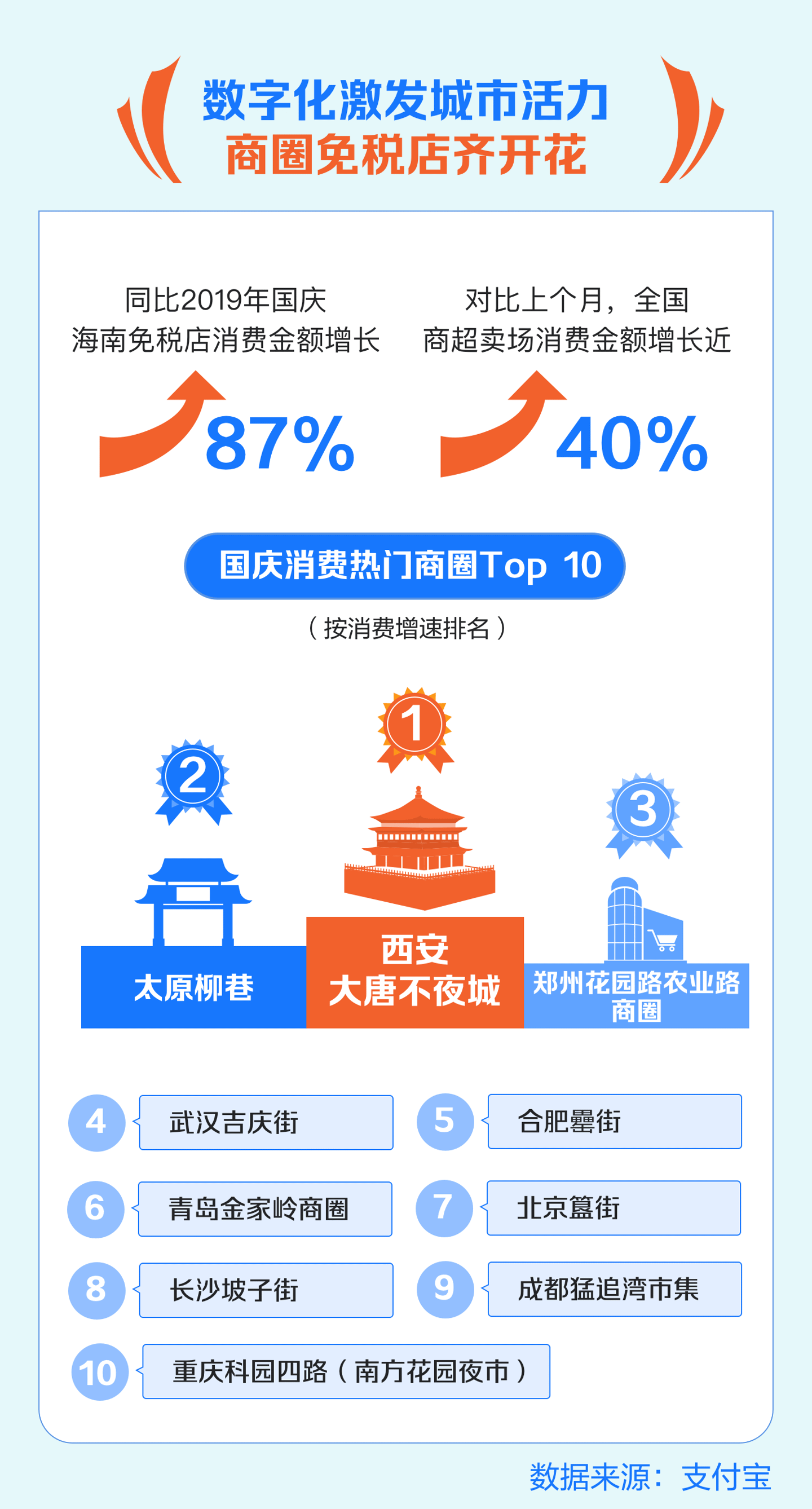 另一方面,假期对内需的拉动作用也持续扩大,全国商超卖场消费金额较上月增长近 40%。其中,西安大唐不夜城商圈消费增速最快,太原、郑州、武汉、合肥、青岛等地的商圈消费热度加快,城市活力突显。