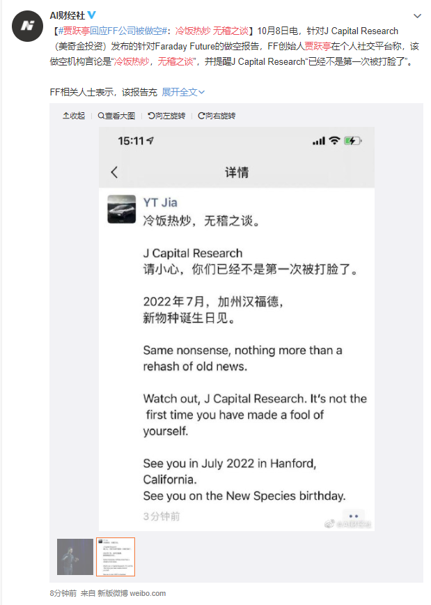 8 日消息 据 AI 财经社报道,针对 J Capital Research(美奇金投资)发布的针对 Faraday Future 的做空报告,FF 创始人贾跃亭今天下午 15:08 在朋友圈发文公开回怼表示:冷饭热炒,无稽之谈。称让 J Capital Research 小心,这已经不是他们第一次被打脸了。最后,贾跃亭表示,2022 年,加州汉福德,新物种诞生日见。