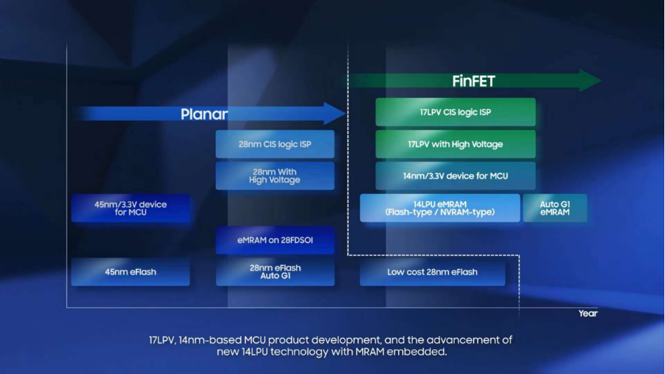 除了 17LPV,三星也公布了用于 MCU 和嵌入式 MRAM 的 14nm 及 14LPU 技术路线。据悉,三星代工部门还打造了 14nm LPU 工艺,即 Low Power Ultimate,但并未透露详情。