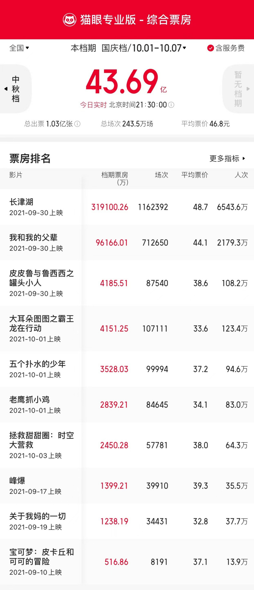 10 月 8 日消息 据猫眼专业版,今年国庆档电影票房已经收官,数据显示,截止 10 月 7 日 21 时,总票房 43.69 亿,为影史国庆档第二名。