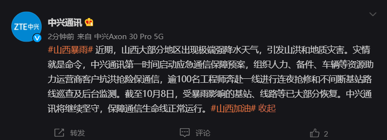 截至 10 月 8 日,受暴雨影响的基站、线路等已大部分恢复。中兴通讯将继续坚守,保障通信生命线正常运行。