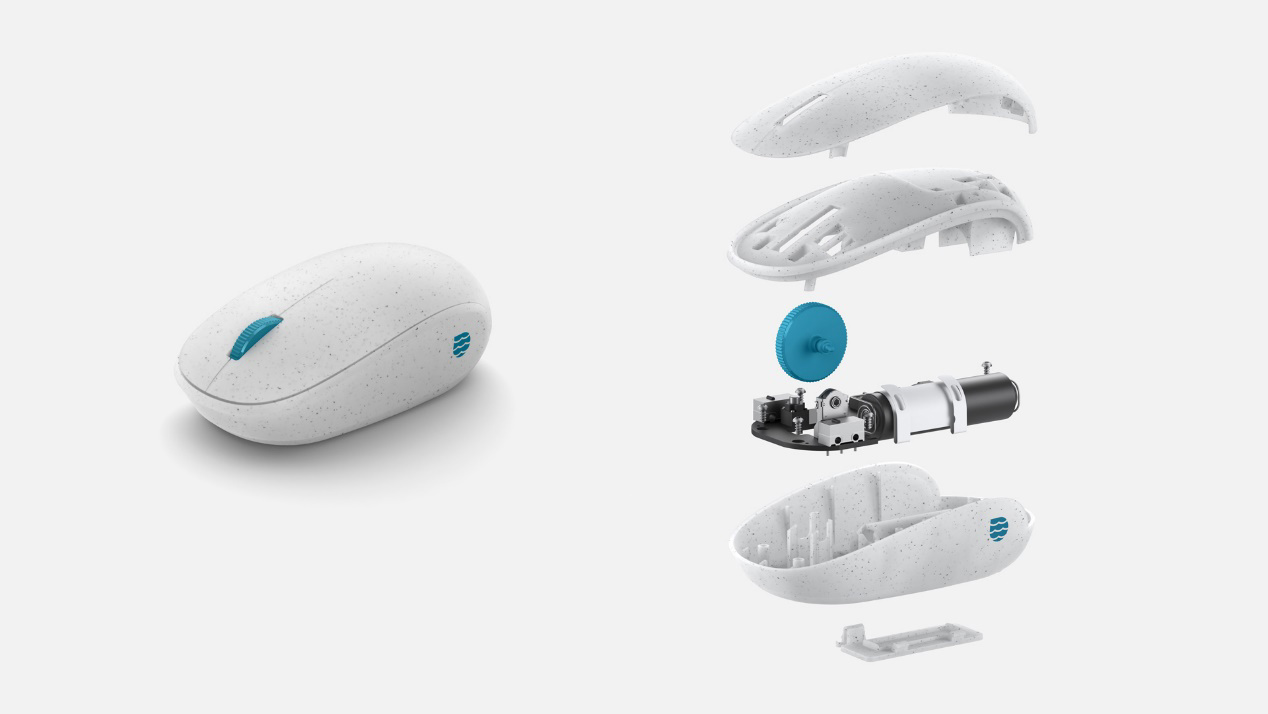 ▲ 微软和 SABIC 开发了一种由可回收塑料瓶制成的树脂用于制造海洋环保鼠标,其中 20% 的材料为可回收海洋塑料。