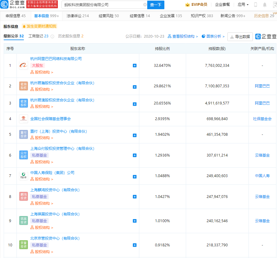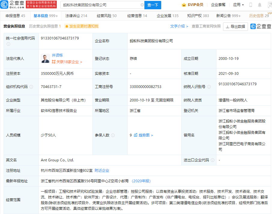 企查查信息显示,蚂蚁科技集团股份有限公成立于 2000 年,法定代表人为井贤栋,经营范围包含:工程和技术研究和试验发展;企业总部管理;控股公司服务;以自有资金从事投资活动等。IT之家获悉,蚂蚁科技集团股份有限公大股东为杭州阿里巴巴网络科技有限公司,持股 32.65%。