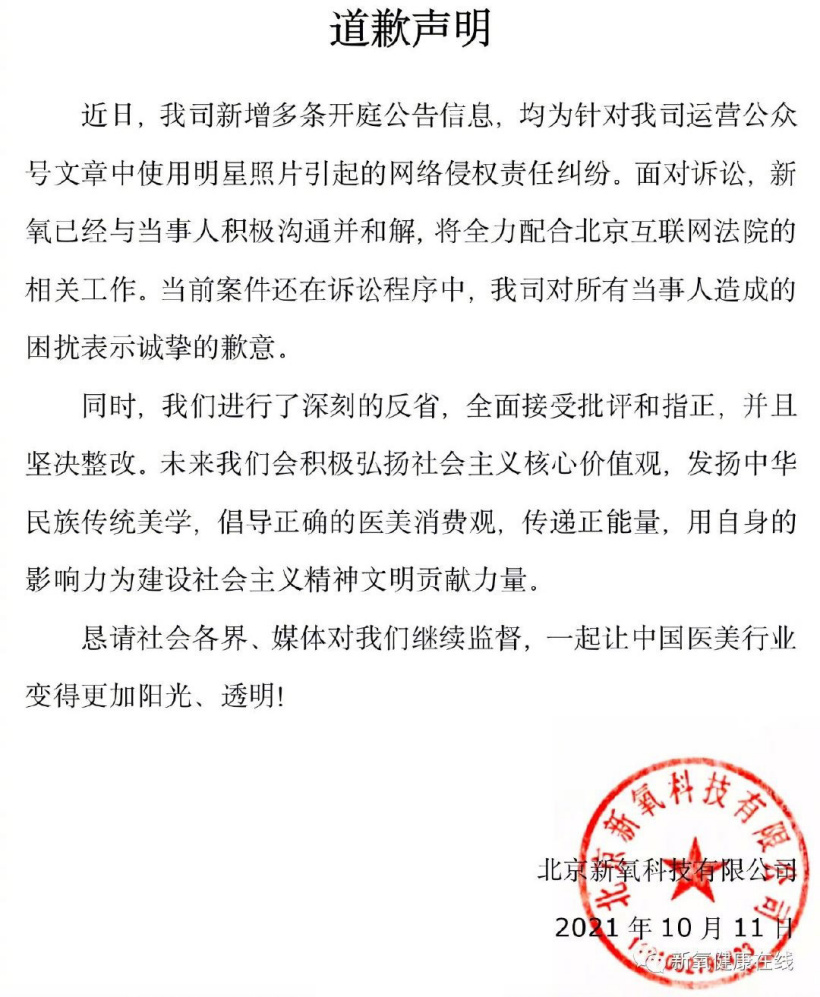 一个月之后,新氧科技今日上午在“新氧健康在线”针对使用明星照片引发的网络侵权责任纠纷向当事人进行道歉。