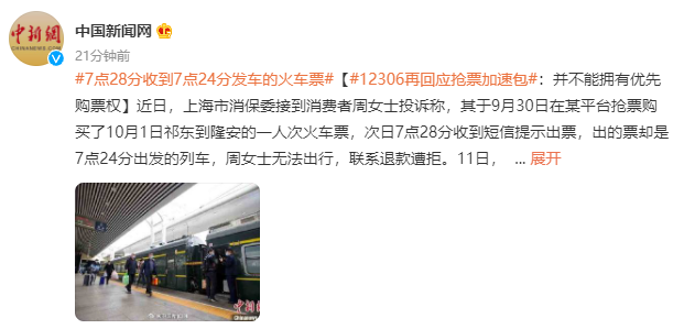10 月 11 日消息 据中国新闻网报道,近日,上海市消保委接到消费者周女士投诉称,其于 9 月 30 日在某平台抢票购买了 10 月 1 日祁东到隆安的一人次火车票。次日 7 点 28 分收到短信提示出票,出的票却是 7 点 24 分出发的列车,周女士无法出行,联系退款遭拒。