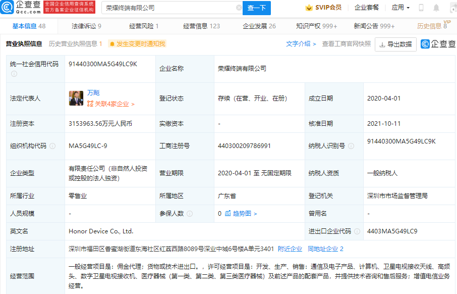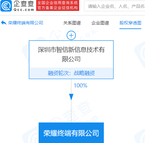 企查查信息显示,荣耀终端有限公司成立于 2020 年,法定代表人为万飚,经营范围包含:开发、生产、销售:通信及电子产品、计算机、卫星电视接收天线、高频头等。IT之家获悉,荣耀终端有限公司由深圳市智信新信息技术有限公司 100% 控股。