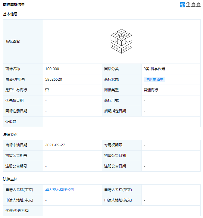 企查查 App 图案显示,该商标由多个符号以及数字 100 000 构成。