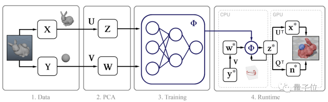 在物理模拟上,他们把要模拟的物体在前 3 帧的位置作为输入,喂给神经网络来预测下一帧,还用主成分分析法(PCA)简化计算,最终把不同类型物理模拟的速度提高了 300-5000 倍。