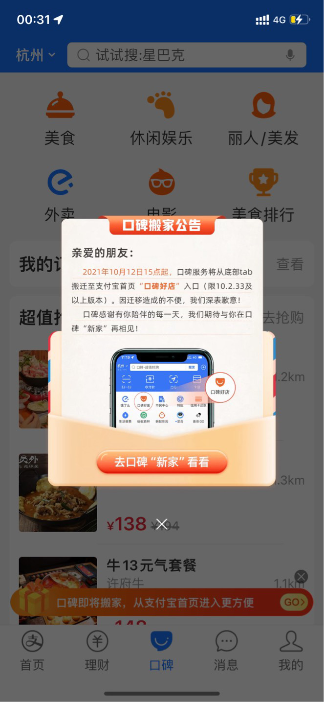 2021 年 10 月 12 日 15 点起,口碑服务将从底部 Tab 搬迁至支付宝首页“口碑好店”入口(限 10.2.33 及以上版本)。因迁移造成的不便,我们深表歉意。