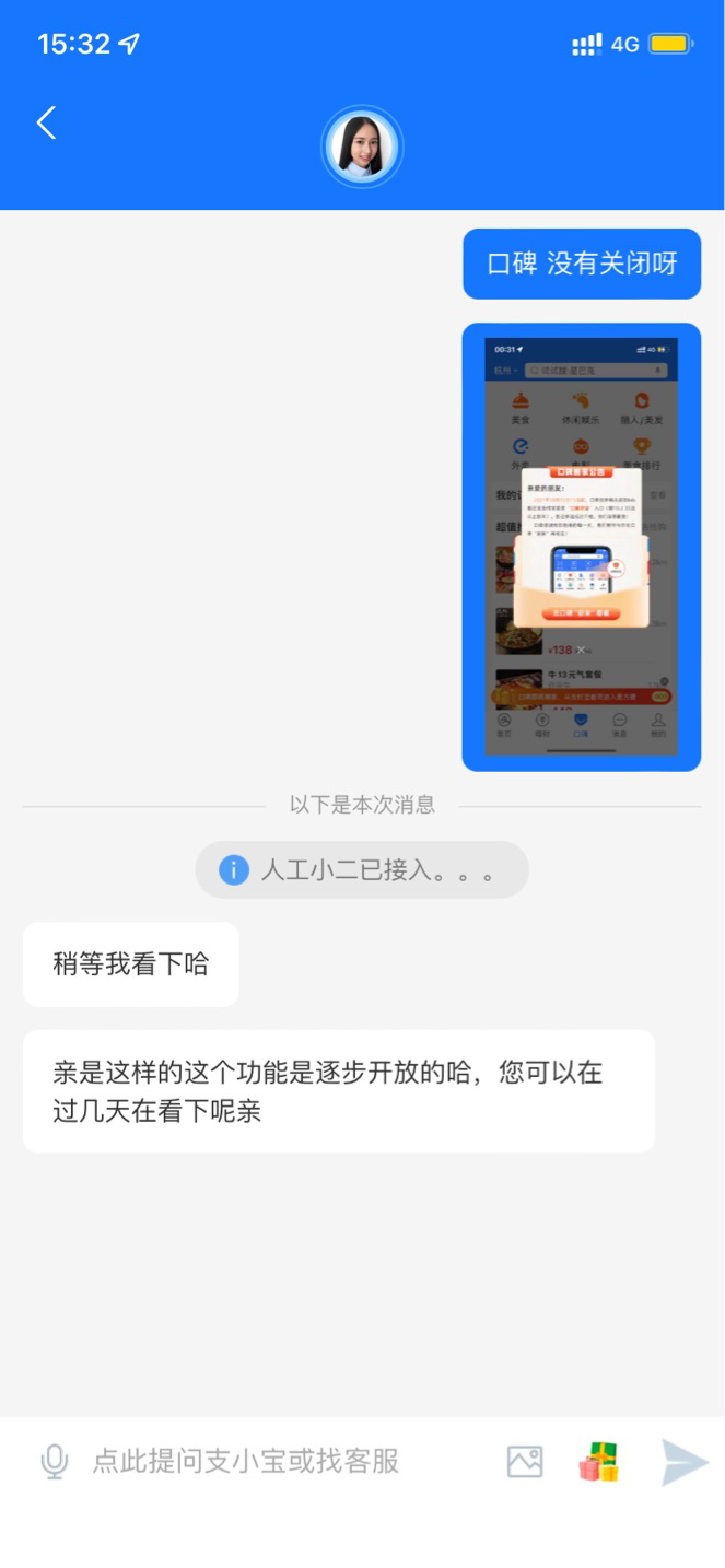 ,支付宝 App 底部 Tab 的“口碑”并不能关闭。对此,支付宝人工客服称:这个功能是逐步开放的,建议过几天再试试看。