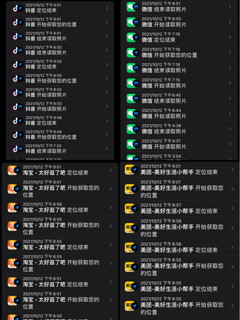 10 月 10 日,数码博主 @轩宁轩 sir 通过隐私洞见 App 监测发现,“美团 App 连续 24 小时定位我,每 5 分钟一次。”随后,有美团工程师称“读取 iOS 15 系统日志的软件 App 为境外人员研发,建议大家谨慎下载”。