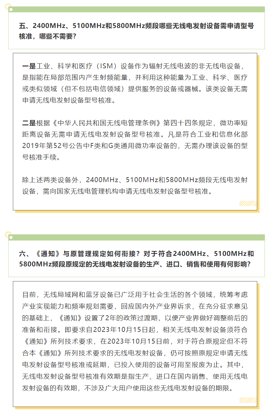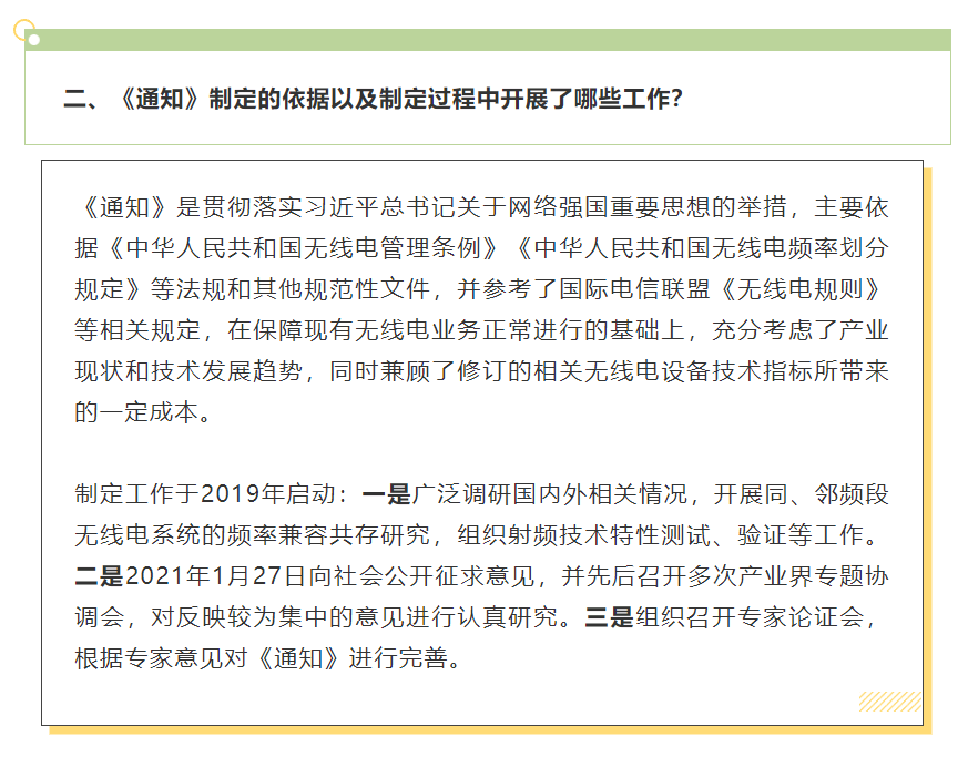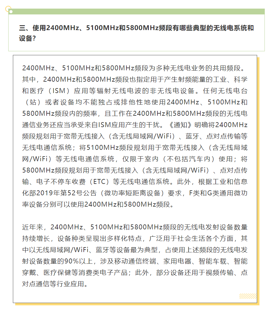 工业和信息化部关于加强和规范 2400MHz、5100MHz 和 5800MHz 频段无线电管理有关事宜的通知:官网链接