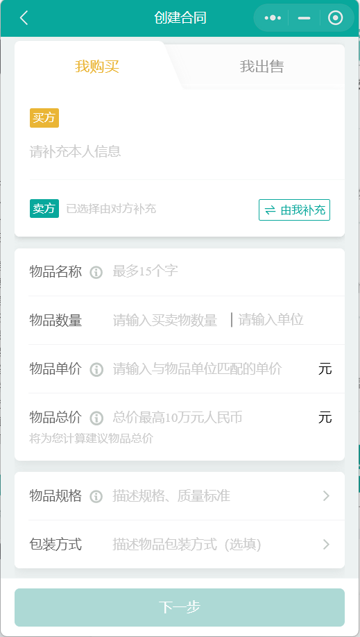 点击发起合同后,双方可以填写个人信息、物品信息、物品价格、包装信息等。