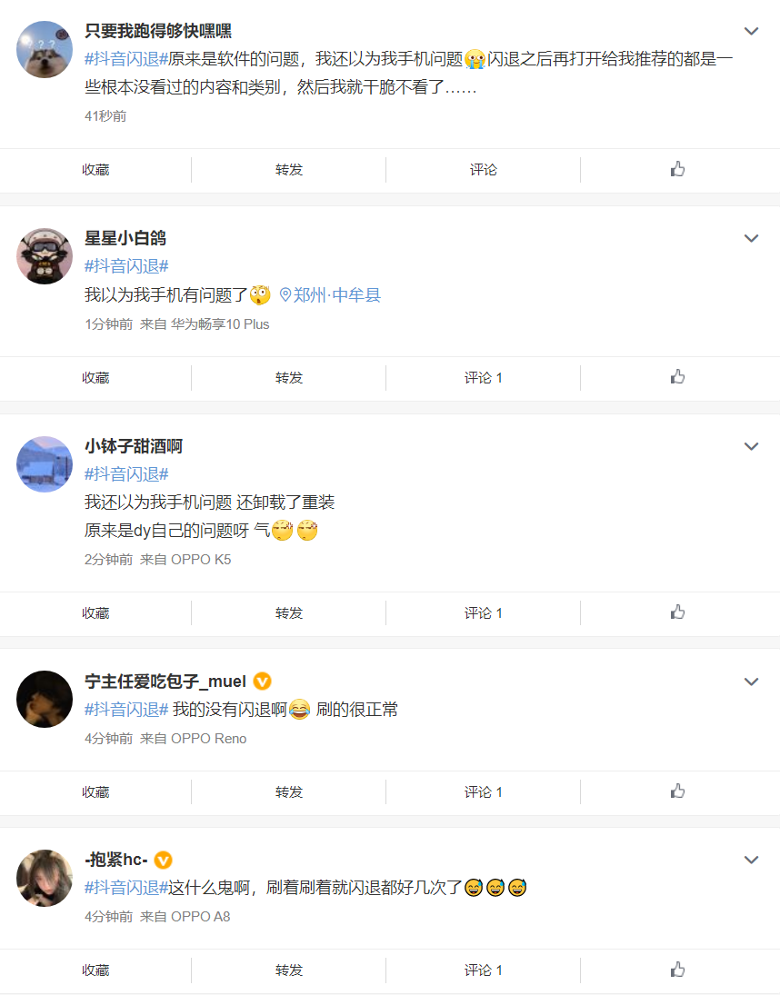 微博上也有不少网友称,遇到了抖音频繁闪退。