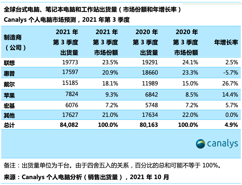 报告显示,在排名前五的个人电脑厂商中,除一家以外,其余厂商的出货量都在 2021 年第 3 季度继续增长。