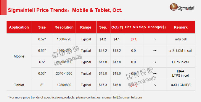 根据群智咨询数据显示,10 月份智能手机面板价格仍呈现分化趋势。其中 a-Si 面板稳中下滑,需求持续下滑,叠加供应侧产能增加,部分面板厂采取低价竞争的策略以争取到更多的订单,a-Si Cell 价格将持续下降。