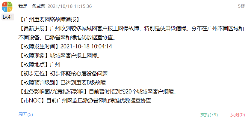 对于此次出现的问题,腾讯方面并未透露具体原因,有IT之家网友猜测是因为服务器网络故障导致,而恰好今日上午广州相关部门通报称收到较多城域网客户报上网慢故障,特别是使用微信慢,该问题分布在广州不同区域和不同设备,初步怀疑核心层设备问题,并表示已派省网和综维优数据室协查。