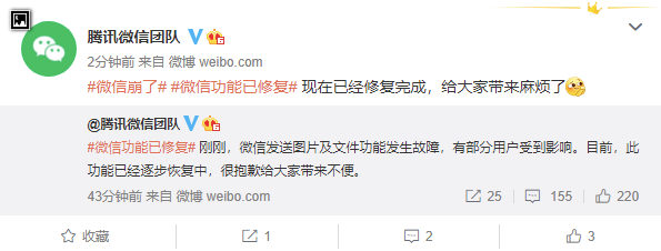 从网友反馈来看,该问题最早或出现在上午 9:50 之前,经历两个小时抢救后,微信功能现已修复完成,微信官方对此再一次致歉。