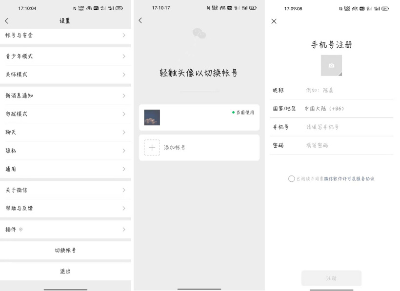 ▲ 正常切换账号以及注册微信号界面