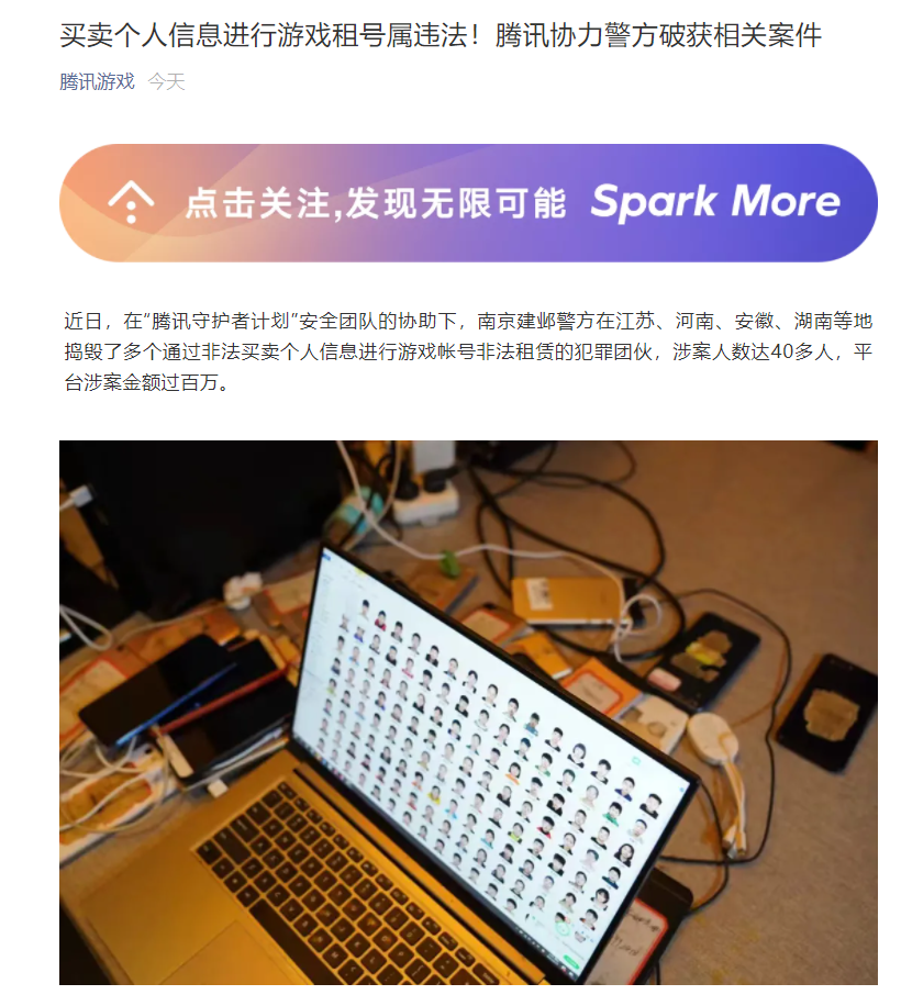 19 日消息,据腾讯游戏官方公众号,近日,在“腾讯守护者计划”安全团队的协助下,南京建邺警方在江苏、河南、安徽、湖南等地捣毁了多个通过非法买卖个人信息进行游戏帐号非法租赁的犯罪团伙,涉案人数达 40 多人,平台涉案金额过百万元。