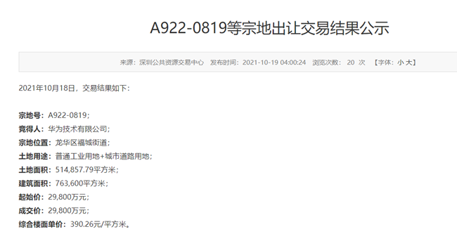 据深圳公共资源交易网显示,华为以 2.98 亿元的价格竞得龙华区一宗产业用地。该宗土地位置在龙华区福城街道,用途为普通工业用地 + 城市道路用地,土地面积 514857.79 平方米,建筑面积 763600 平方米。