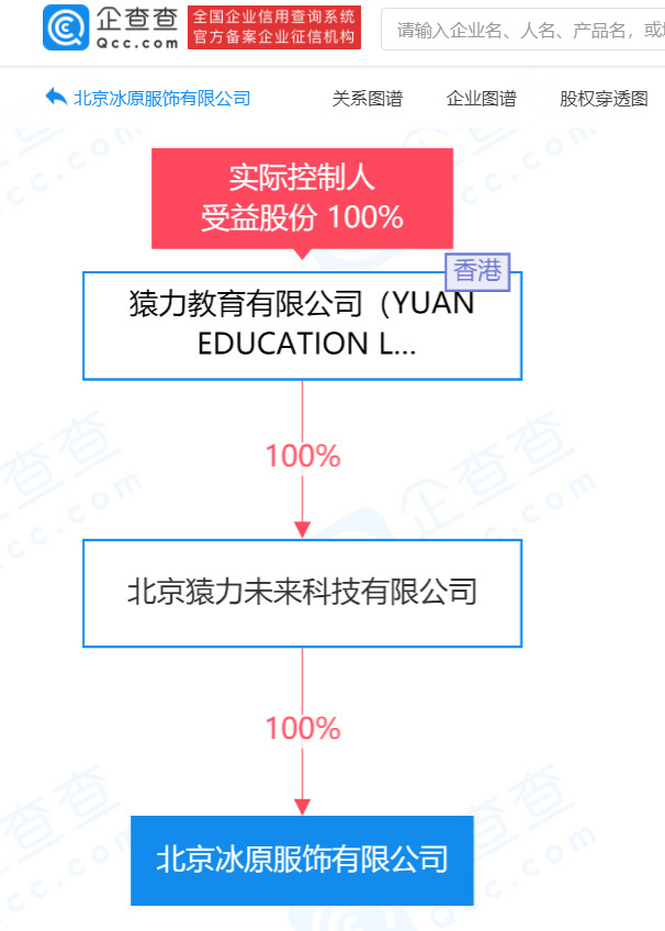 企查查股权穿透显示,北京冰原服饰有限公司由北京猿力未来科技有限公司 100% 控股,而北京猿力未来科技有限公司由猿力教育有限公司 100% 控股。