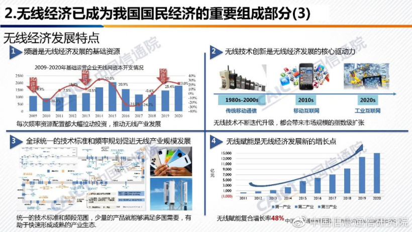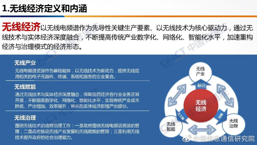 官方介绍,《白皮书》首次定义了无线经济的概念并测算了其规模,认为无线经济是以无线电频谱作为关键生产要素、以无线技术为核心驱动力,通过无线技术与实体经济深度融合,不断提高传统产业数字化、网络化、智能化水平,加速重构经济与治理模式的经济形态。