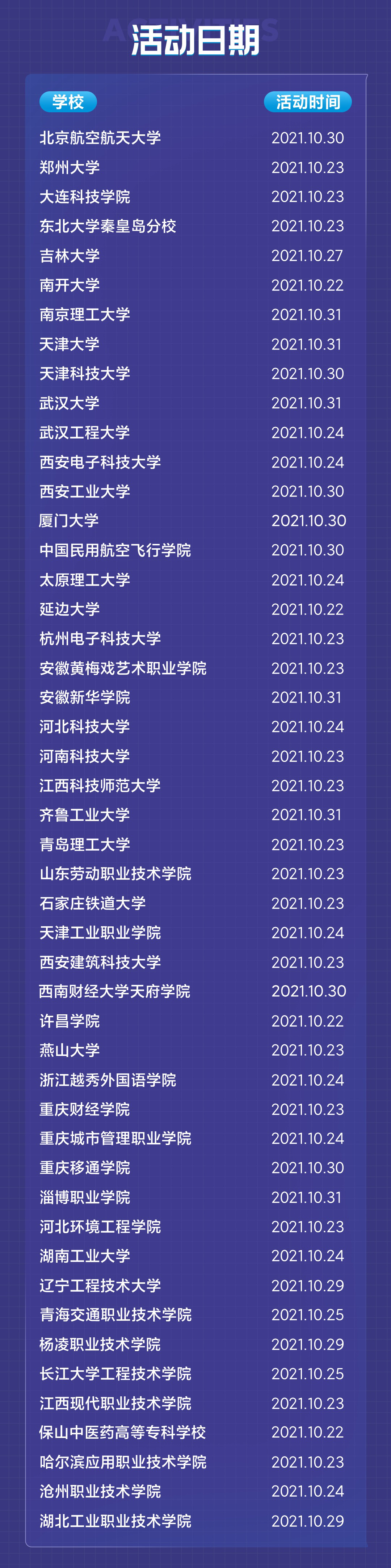 小米校园科技畅聊日活动在不同高校的开展时间不同,最早的将在 10 月 22 日开启,最晚的定于 10 月 31 日。以下为详细这 48 所高校的具体活动日期: