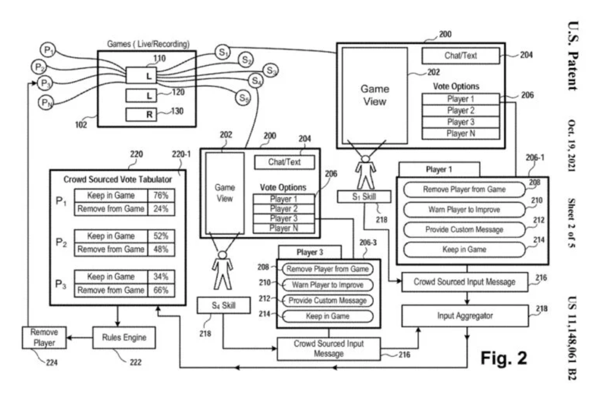 该专利名为“视频游戏中观众投票替换玩家”,于 2020 年 1 月提交,于本周二获得批准。所描述的功能允许观众投票删除(或“替换”)玩家,或向他们发出消息警告,希望他们发挥更好。