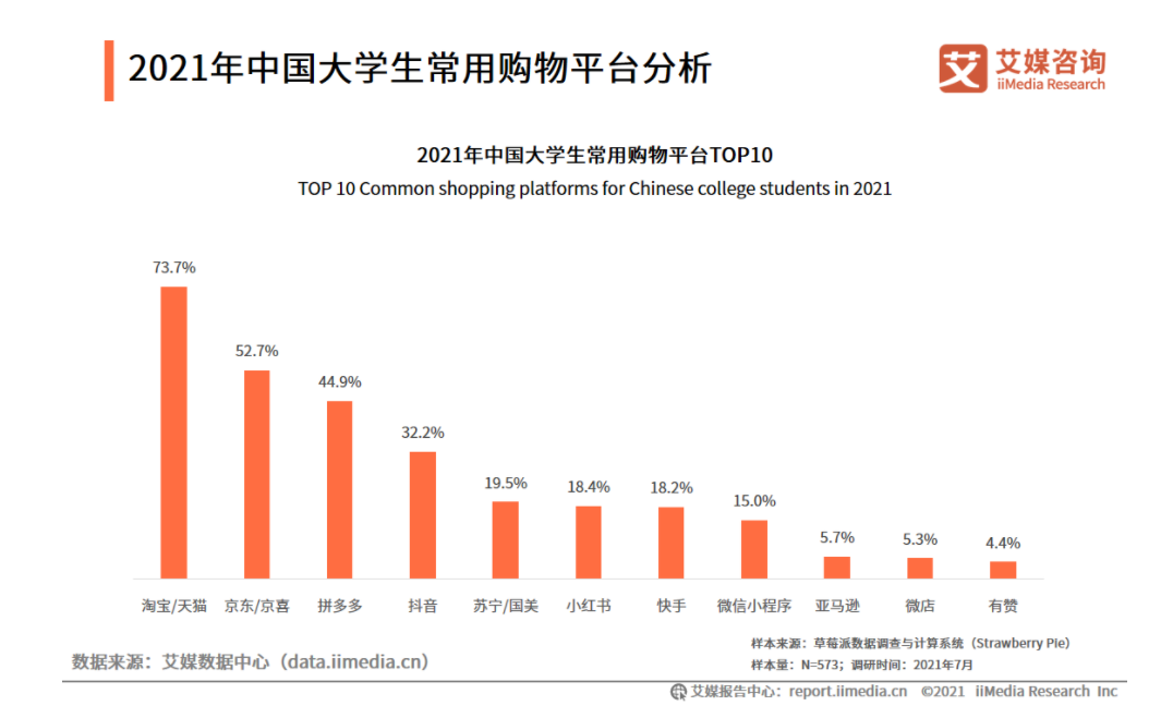 在艾媒咨询的 2021 中国大学生常用购物平台分析和 Mob 研究院的“后浪”网购图鉴中指出,淘宝在这两大榜单中均排在首位,特别是在大学生群体中淘宝/天猫的份额占比达到 73.7%。当前我国的在校大学生人数为 4183 万,一旦这部分人群的购买意愿得到一定程度的释放,将形成不容小觑的消费规模。
