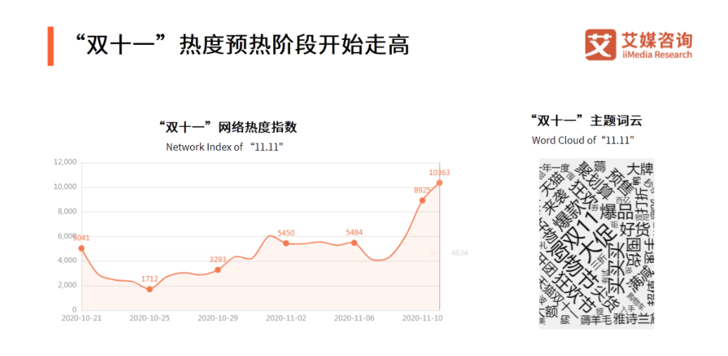 参考去年的案例,在整个天猫双 11 活动期间内,随着不同环节的开展,活动的网络热度会呈现出明显的递增趋势,每一次关键活动的节点内均会出现一次流量高峰,其中首波活动预售期的热度较高,但因为距离双 11 当天的时间较远,网络热度总体上不如 11 月之后的其它活动。