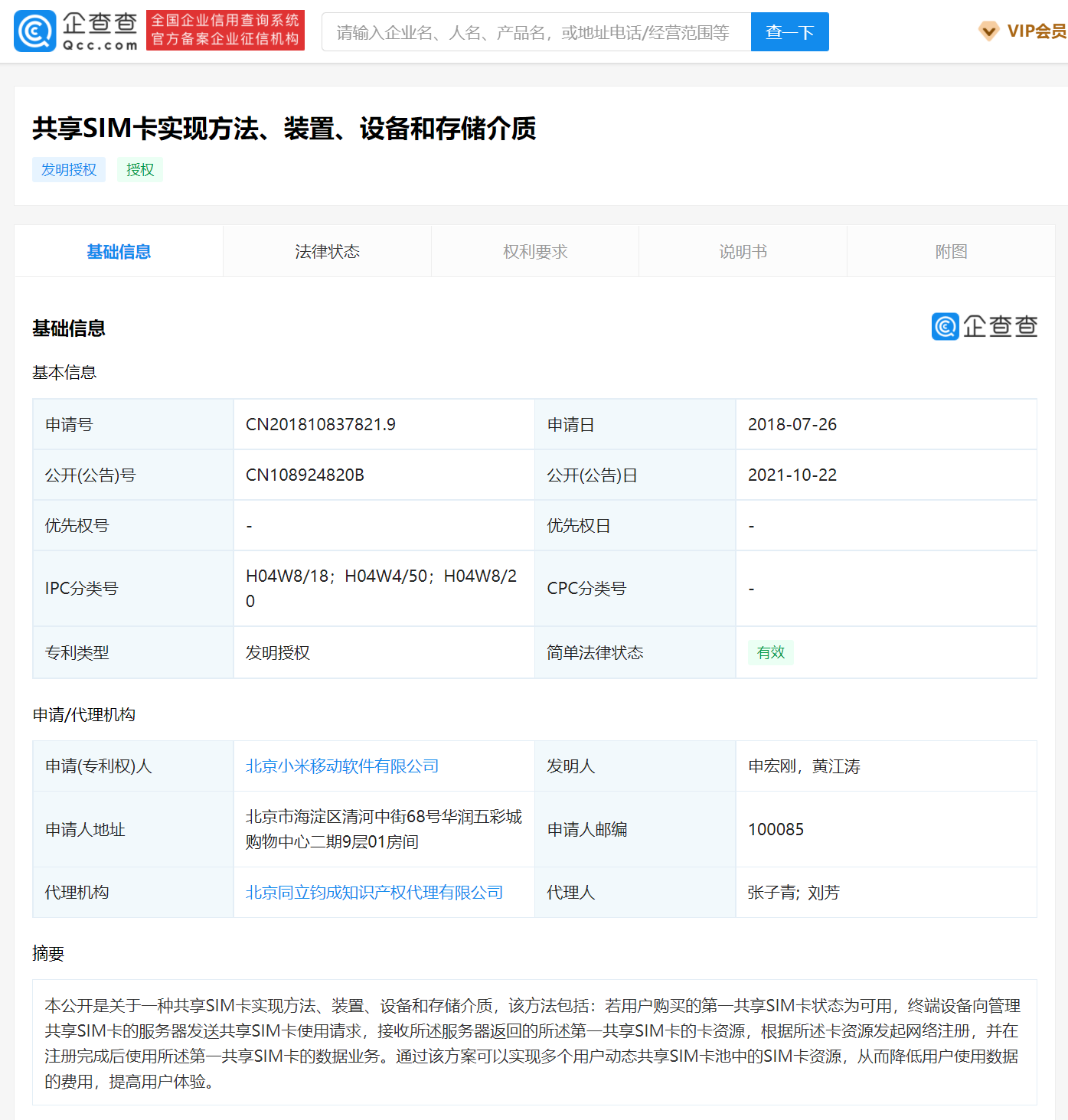 22 日消息,今日,北京小米移动软件有限公司“共享 SIM 卡实现方法、装置、设备和存储介质”专利获授权,公开号为 CN108924820B。