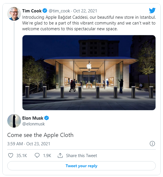 几小时后马斯克回复道:“快来看苹果抛光布。”