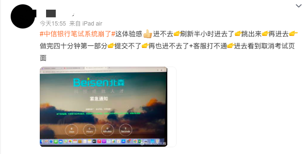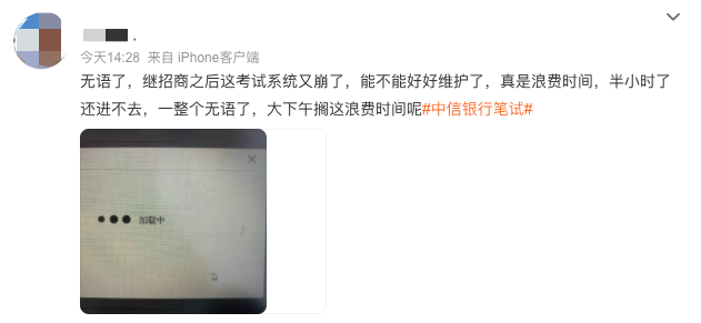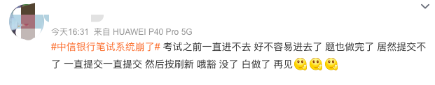 10 月 22 日下午,大量网友在微博发文称自己在参加中信银行校招在线笔试时考试系统崩了。