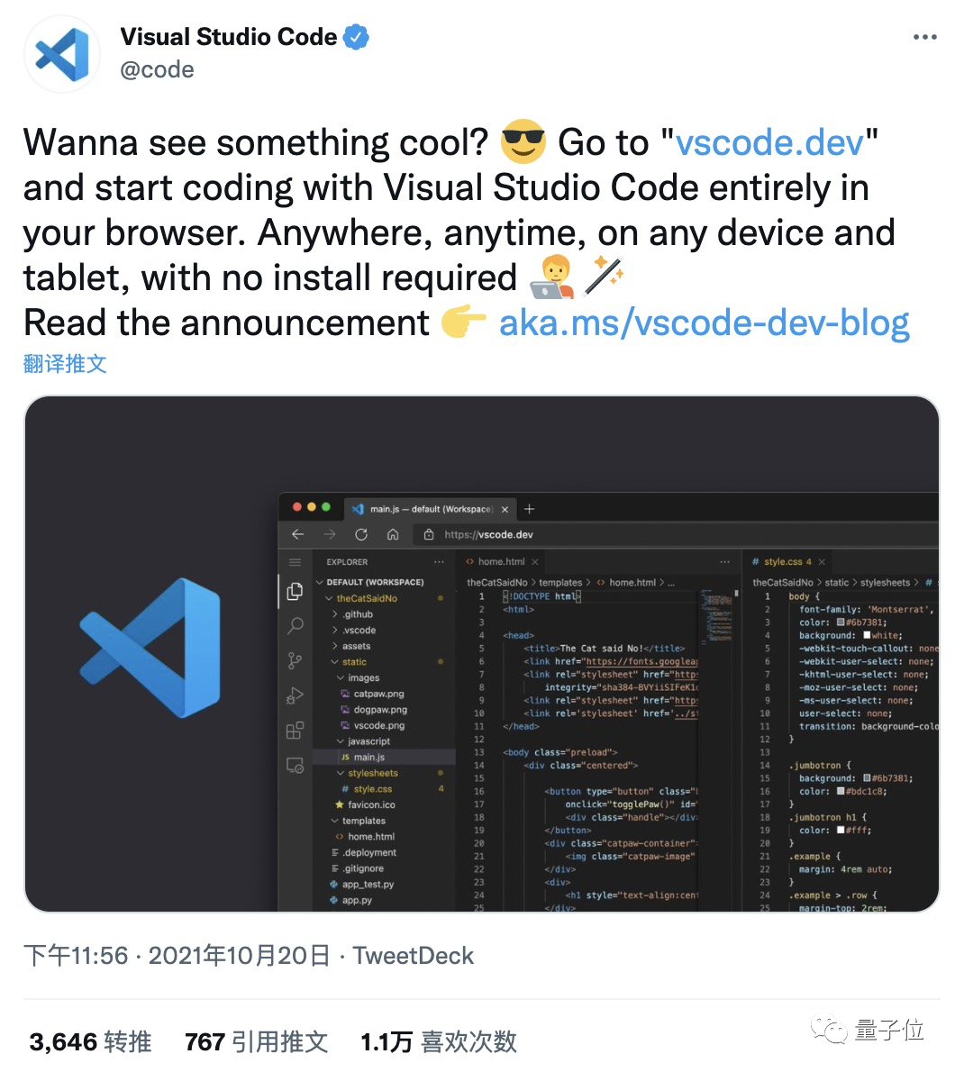 最后,虽然这次发布的这个网页版 VS Code 还不能和桌面端媲美,但微软此番愿景就是能让大家真正实现在任何地方写任何代码,所以它叫大家“敬请期待更多”。