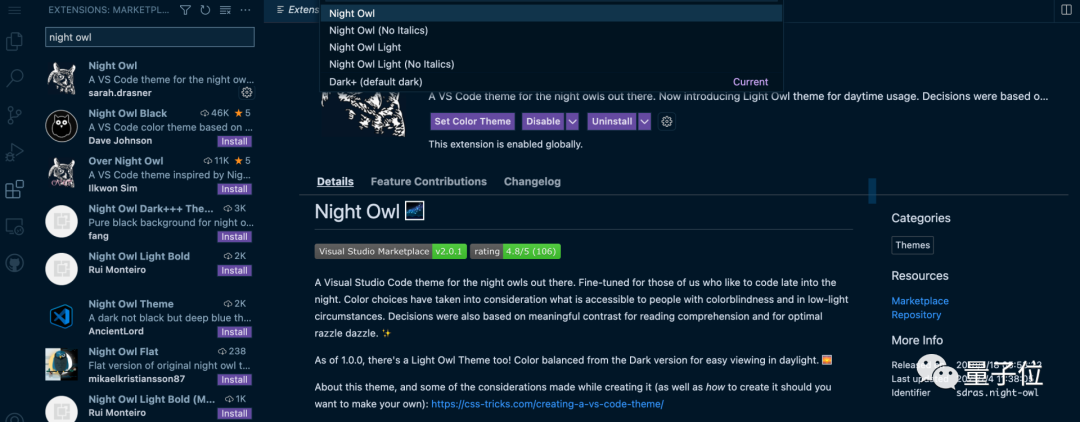 虽说大多数 UI 插件(主题、热键等)都能用,比如下面这个“Night Owl”: