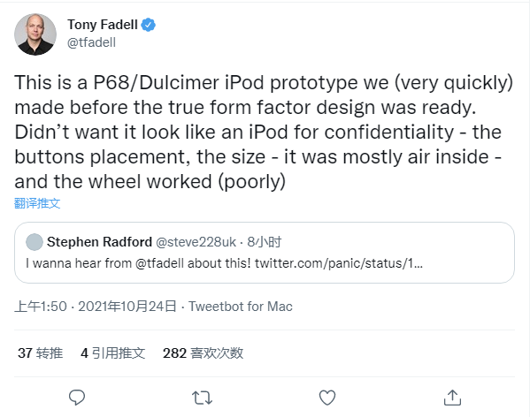 此外, iPod 之父 Tony Fadell 在推特上发布了更多关于这款原型的细节。Fadell 说,这款机型被称为“P68/Dulcimer”,专门设计用于隐藏 iPod 的最终设计不被窥探。