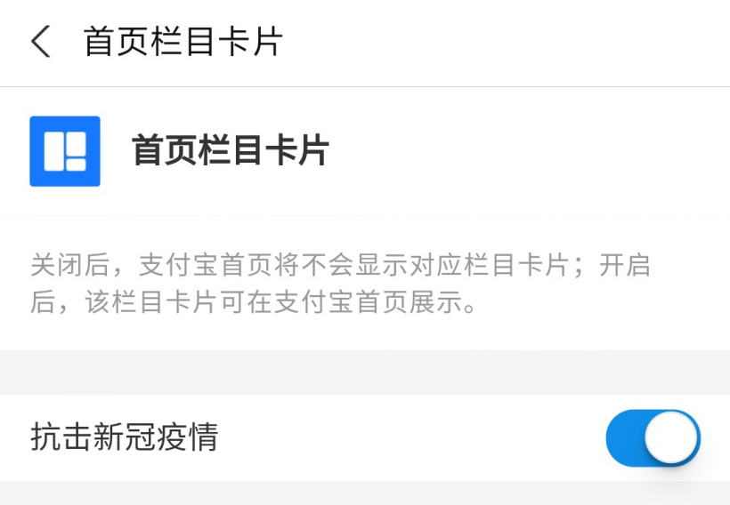 IT之家网友 @剪辑迷 的支付宝版本号为 10.2.36,然而经过IT之家测试,iOS 版与安卓版支付宝 App 同版本下均未出现此功能,只有一个“抗击新冠疫情”栏目卡片可关闭,因此该功能是面向部分用户的测试。