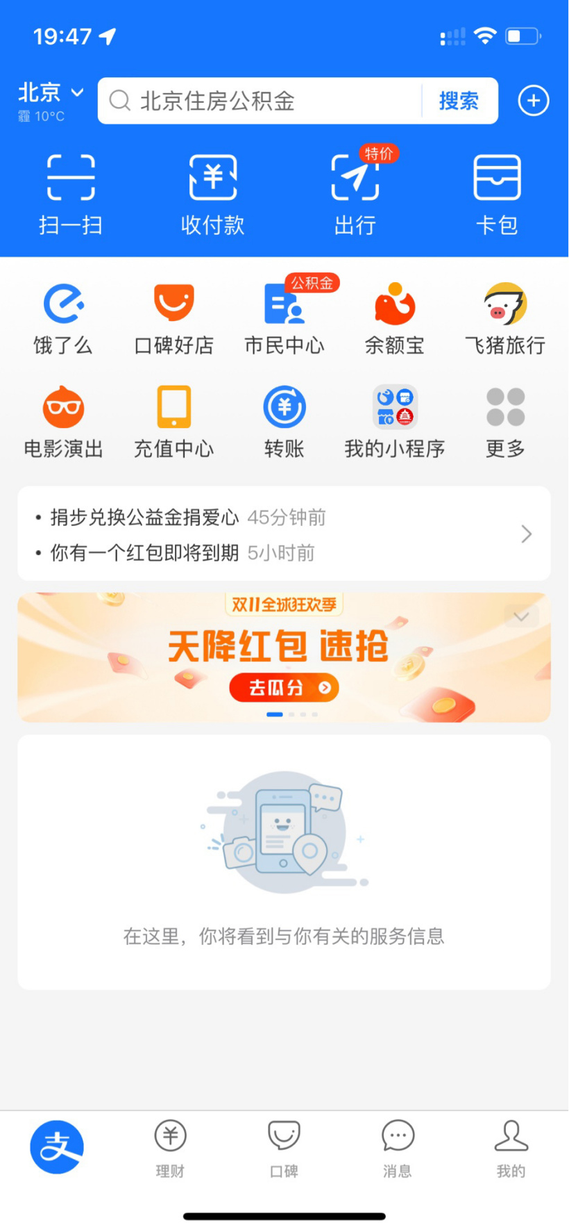 从下图可以看到,关闭所有首页栏目卡片后,功能区下方只显示“在这里,你将看到与你有关的服务信息”,下方一长串服务内容都已消失。