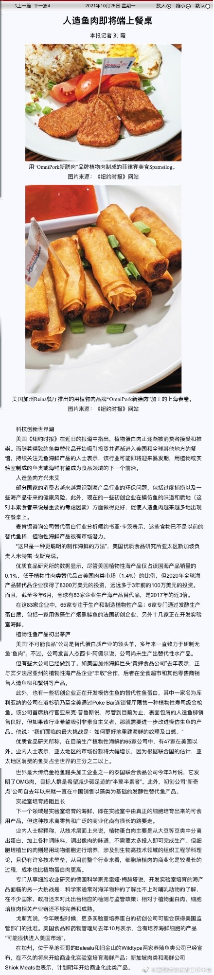 优质食品研究所称,在目前生产植物性海鲜的65家公司中,有47家在美国以外。业内人士表示,亚太地区的市场份额将大幅增长,因为根据联合国的估计,亚太地区消费的鱼类占全世界的三分之二以上。(科技日报)