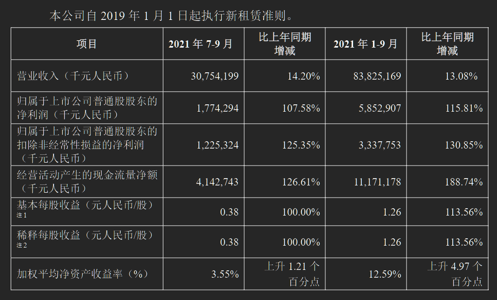 2021 年 7-9 月,公司单季度归属于上市公司普通股股东的净利润 17.7 亿元,同比增长 107.6%,单季度归属于上市公司普通股股东的扣除非经常性损益的净利润 12.3 亿元,同比增长 125.4%。