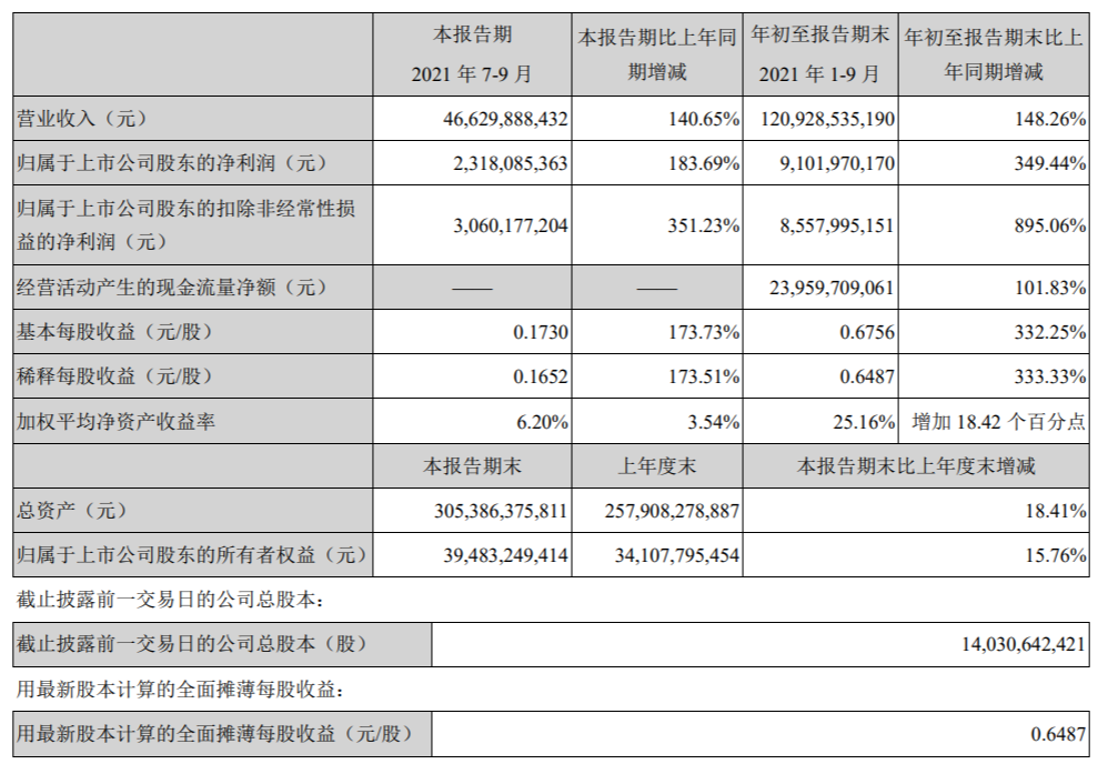 TCL 科技表示,前三季度,公司实现营业收入 1209.3 亿元,同比增长 148.3%;半导体显示、半导体光伏和半导体材料业务全面超额完成预算,业绩创历史新高。