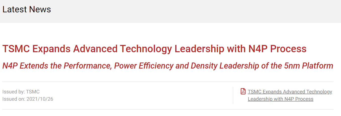 ,N4P 制程工艺将在 Open Innovation Platform 合作伙伴帮助下加快产品开发周期,首批基于 N4P 制程工艺的产品有望在 2022 年下半年流片。