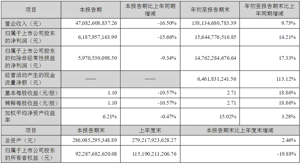 前三季度实现营收 1381.35 亿元,同比增长 9.73%;净利润 156.45 亿元,同比增长 14.21%。