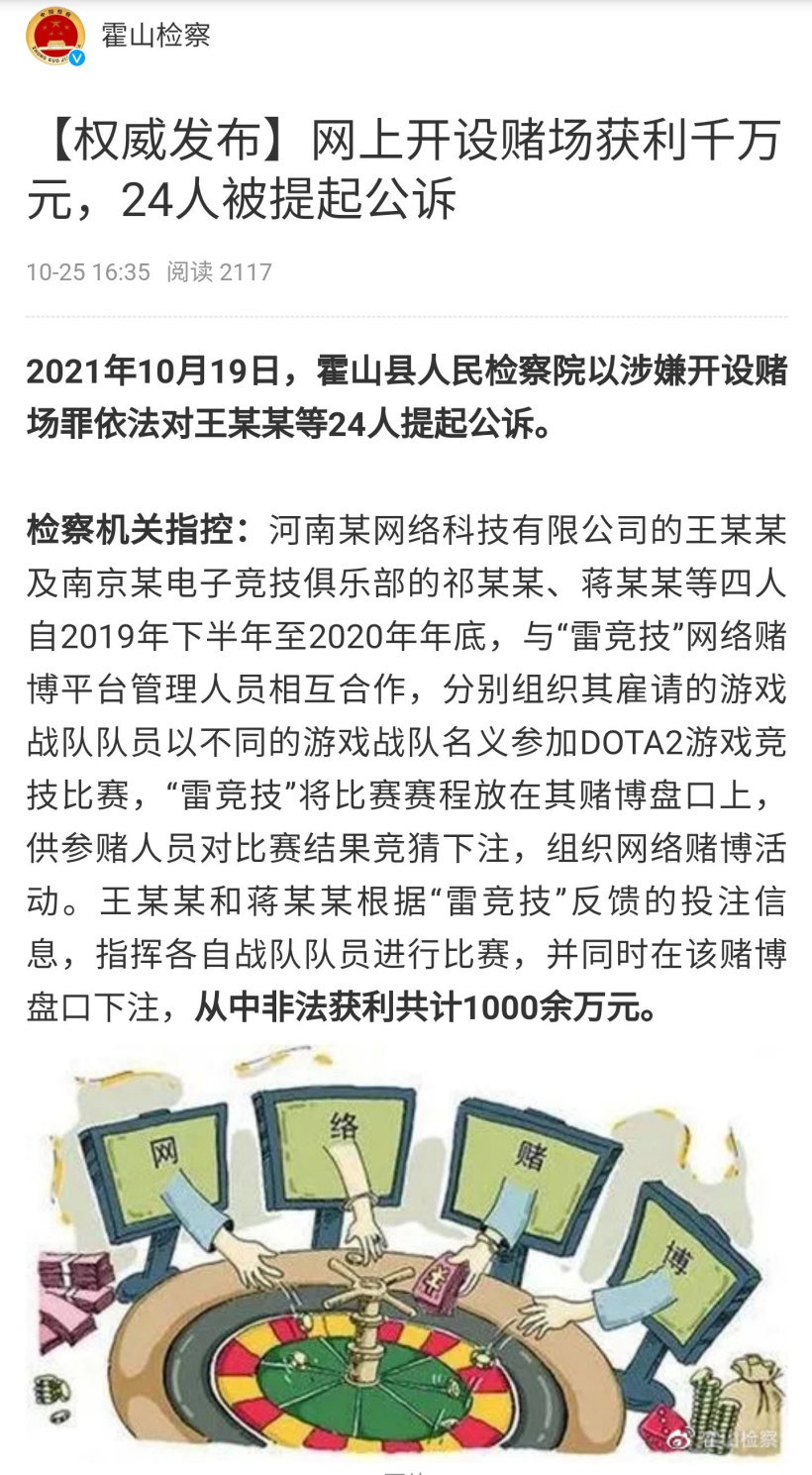 六安市 @霍山检察 表示,河南某网络科技有限公司的王某某及南京某电子竞技俱乐部的祁某某、蒋某某等四人自 2019 年下半年至 2020 年年底,与“雷竞技”网络赌博平台管理人员相互合作,分别组织其雇请的游戏战队队员以不同的游戏战队名义参加 DOTA 2 游戏竞技比赛,“雷竞技”将比赛赛程放在其赌博盘口上,供参赌人员对比赛结果竞猜下注,组织网络赌博活动。王某某和蒋某某根据“雷竞技”反馈的投注信息,指挥各自战队队员进行比赛,并同时在该赌博盘口下注,从中非法获利共计 1000 余万元。