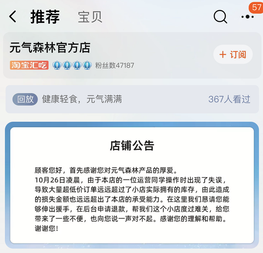▲ 元气森林店铺公告